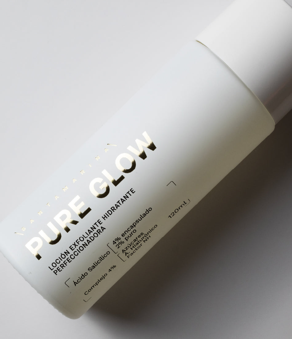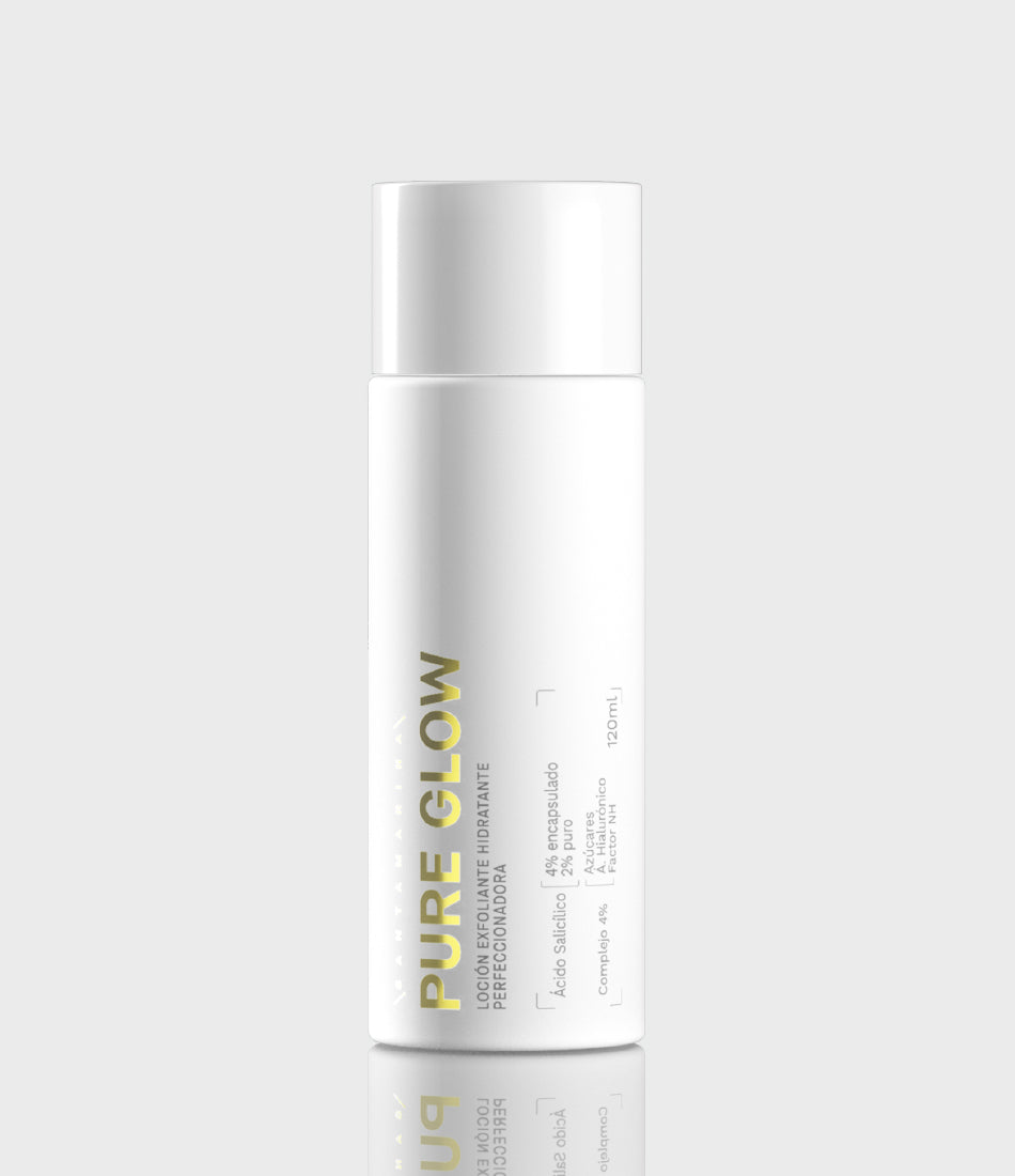 PURE GLOW es una loción facial exfoliante e hidratante de uso diario formulada con ácido salicílico encapsulado al 4% (2% puro), niacinamida y un complejo hidratante biomimético avanzado que estimula la producción de ácido hialurónico y factores naturales de hidratación (NMF).