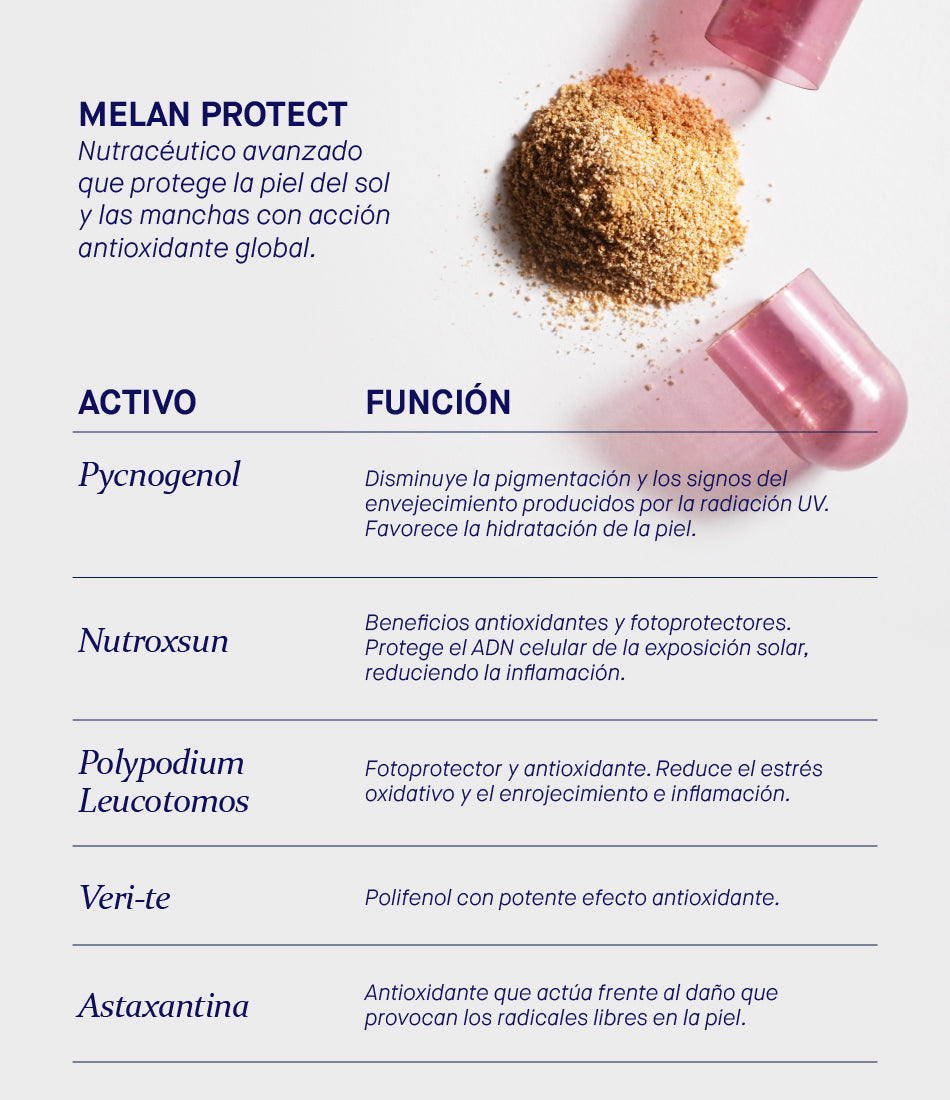Nutracéutico avanzado que protege la piel del sol y las manchas con acción antioxidante global.
